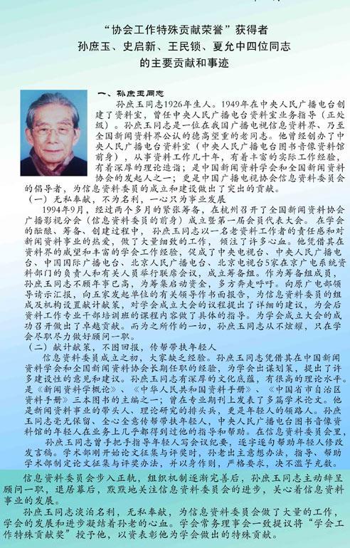 作为筹备组成员,孙庶玉同志不顾年事已高,为筹集启动资金,多方奔走呼吁。向原广电部领导请示汇报,向五家发起单位的有关领导作书面报告,为信息资料委员的组成及机构设置献计献策,对学会成立大会的议程提出了详细的建议,为会后资料工作专业干部培训班的课程内容做了具体的指导。为学会成立大会的成功召开做出了卓越贡献。而为之所作的一切,孙庶玉同志从不炫耀,只在学会尽职尽力做好顾问一职。