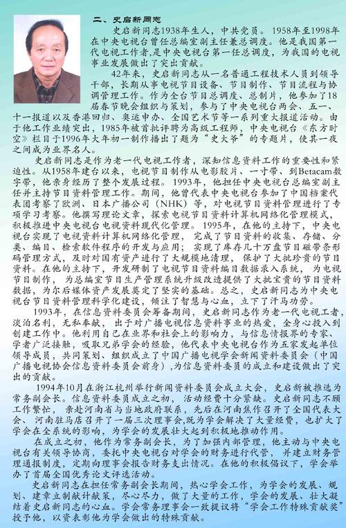 1993年,在信息资料委员会筹备期间,史启新同志作为老一代电视工作者,淡泊名利,无私奉献,出于对广播电视信息资料事业的热爱,全身心投入到创建工作中。他利用自己在业界和社会上的影响力,与信息情报界的专家、学者广泛接触,吸取兄弟学会的经验,他代表中央电视台作为五家发起单位领导成员,共同策划、组织成立了中国广播电视学会新闻资料委员会(中国广播电视协会信息资料委员会前身),为信息资料委员的成立和建设做出了突出的贡献。