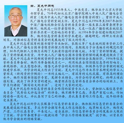夏允中同志从1994年至2007年担任中国广播电视协会信息资料委员会第一届至第三届常务理事会顾问。他既是一位学者型领导,又是一位在广播影视系统信息资料界具有一定影响力的专家。从1994年学会创建初期到2007年,他为信息资料委员的学术建设、课题研究、科研立项出谋划策,对推动信息资料委员会的发展起到了极大的作用。